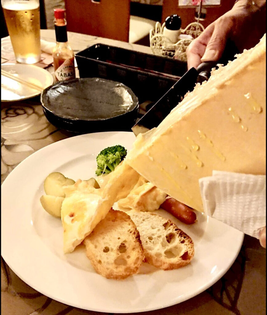 バケット・ソーセージ・ジャガイモ・ブロッコリーにクセのない美味しいラクレットチーズをたっぷりとかけた人気の一品です